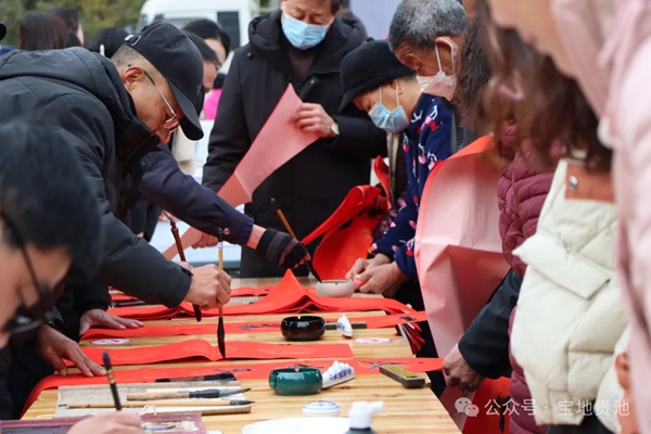 活動現場,志愿者們齊發力,熱情地向在場群眾介紹起此次宣傳的內容,義診臺前,群眾排起了長隊進行測量血壓等一系列醫療保健服務。另一邊書畫展示臺前同樣也圍滿了人,原來是區文聯的各位老師趁著新年到來前,為大家送上一幅幅充滿“年味”的書畫作品與對聯,圍觀居民們屏氣凝神地看著書畫老師們落筆,一撇一捺間,新年的祝福與時代新風落進了大家心里?!巴ㄟ^此次活動,我們創作了一系列吉祥喜慶與移風易俗的書畫春聯,預祝大家能夠過個祥和歡樂的新年?!眳^文聯美術家協會副主席章大方高興地說。