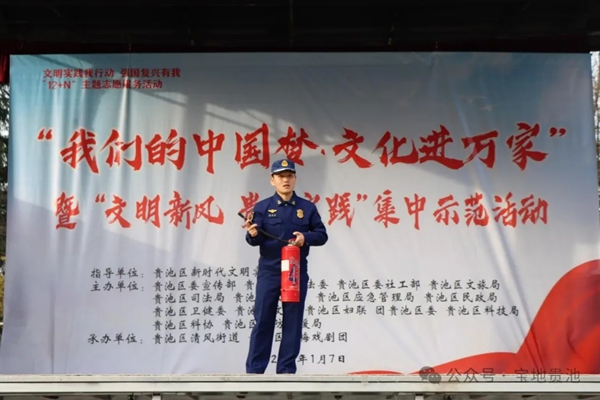 志愿者們忙得熱火朝天,臺上也鑼鼓一響好戲登場,黃梅戲、中醫健身操八段錦,反詐、婚俗改革快板等節目輪番上演,好評不斷。值得一提的是,區消防救援局也為此次活動專門準備了節目,消防員在臺上圍繞家庭安全用火用電進行了詳細的講解,并向大家展示滅火器的正確使用方法,群眾紛紛駐足觀看?!疤貏e榮幸能夠參加此次活動,在這里給大家帶來正確的消防知識,希望大家能夠安全過冬,迎接新春?!眳^消防救援局消防員孫華東說道。