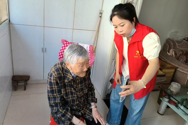 新入職社區工作者到居民家中走訪,幫助行動不便的老人進行退休認證